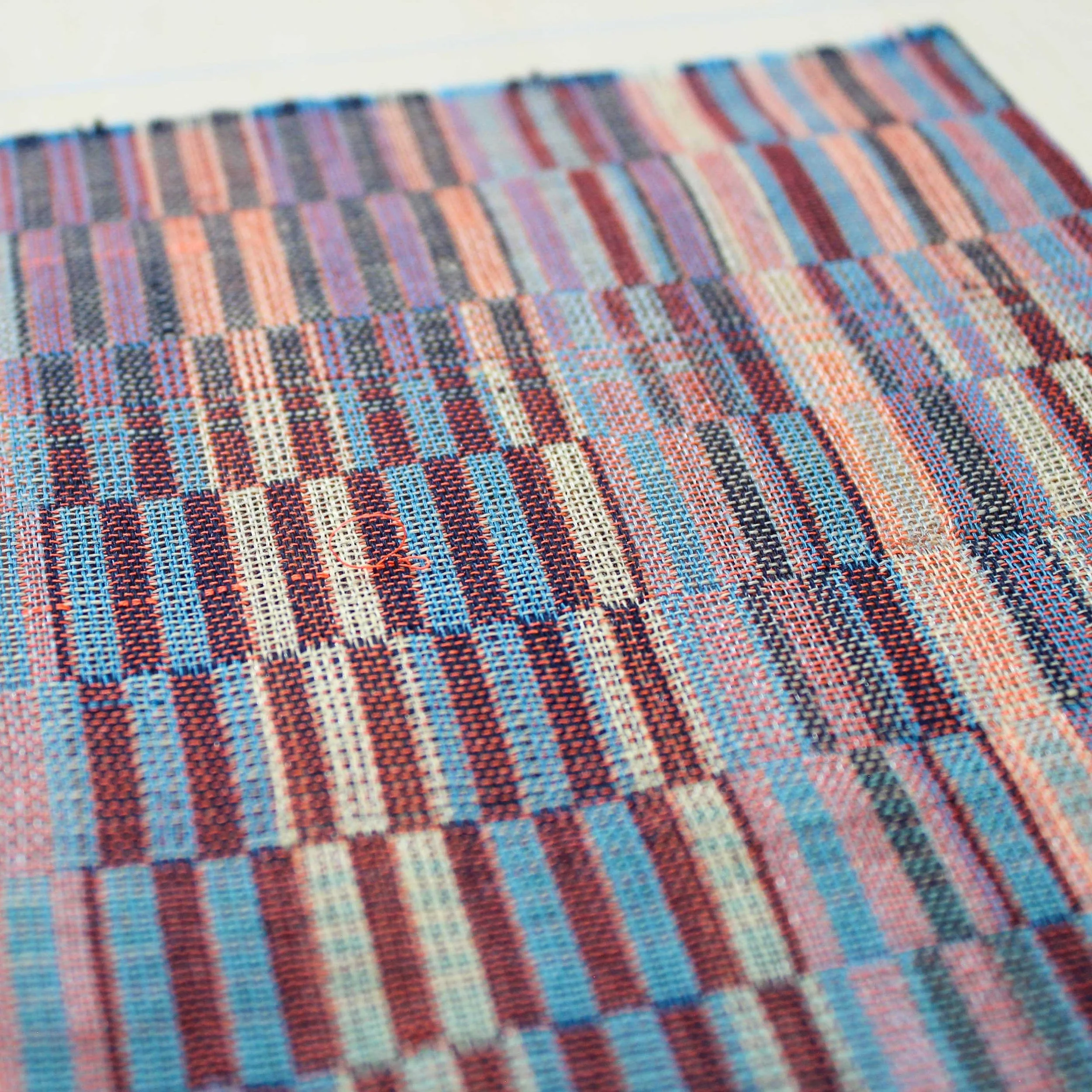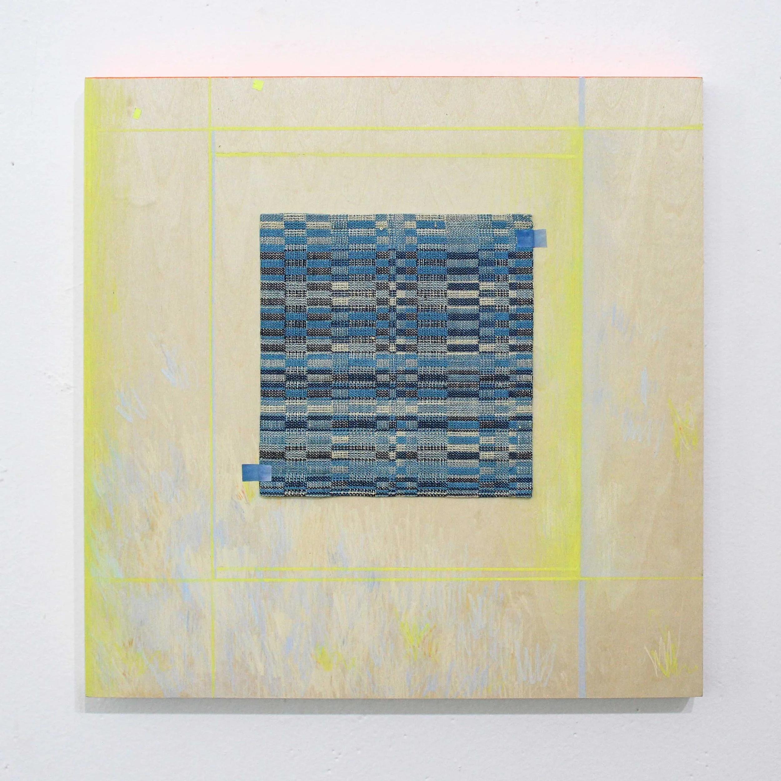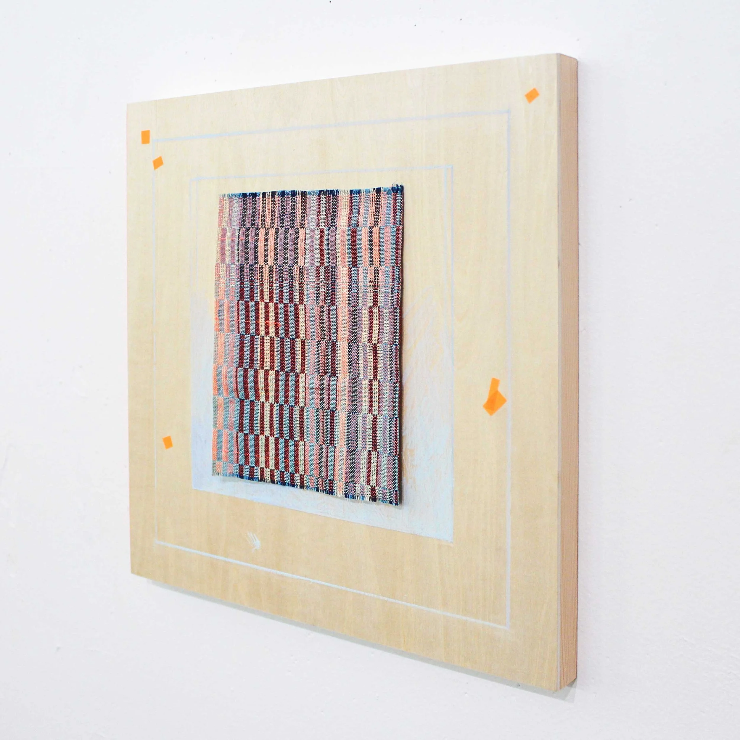 handwoven stainless steel, nylon, linen, and silk, colored pencil on birch, acrylic paint, tape