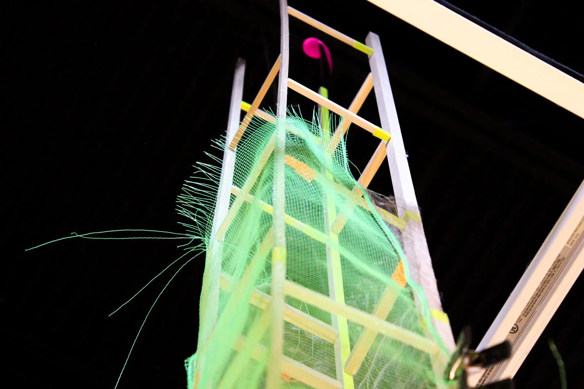 handwoven silk, linen, nylon, and stainless steel, concrete, dowels, flagging tape, clamps, paint, artificial turf, plastic wrap, found materials